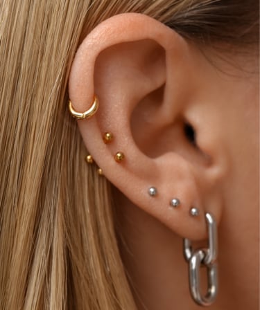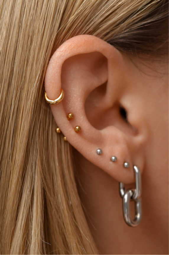 Les oreilles “curated” sont partout : plusieurs piercings placés avec soin pour créer un ensemble harmonieux. Les bijoux minimalistes sont à la mode, tout comme les finitions en titane noir ou doré.
